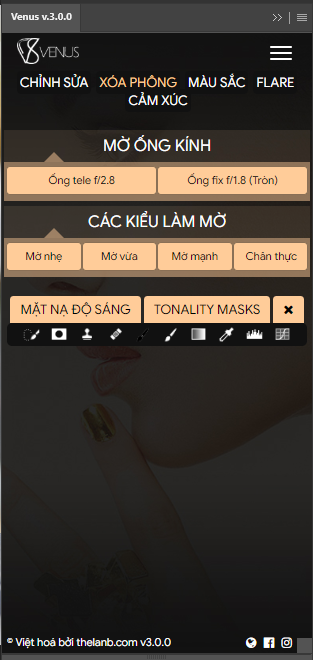 BOKEH (Xóa Phông Nghệ Thuật): Được nghiên cứu dựa trên đặc tính quang học của các dòng ống kính chân dung tiêu cự vàng. Công cụ này giúp bạn tạo ra hiệu ứng xóa phông thực tế và mềm mại. Bạn có thể tùy chọn các mức độ xóa phông giả lập theo khẩu độ f/1.8 hoặc f/2.8 để tạo chiều sâu cho bức ảnh.